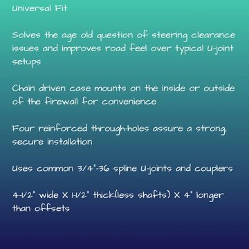 Steer Clear WIZARD FABRICATION is proud to offer Steer Clear, our award-winning offset steering coupler. Steer Clear can be ordered in six standard lengths, 8", 10", 12", 14", 16",or 18" measured from input shaft to output shaft. The overall case length is 4 1/4" longer, so finished dimensions are 4-1/4" wide by 1-1/2" deep by 12-1/4", 14-1/4", 16-1/4", 18-1/4", or 20-1/4" lengths. There is no difference in price for the six standard length units. Steer Clear is available in either a brushed (satin) or polished finish. (Additional charge for the polished finish)